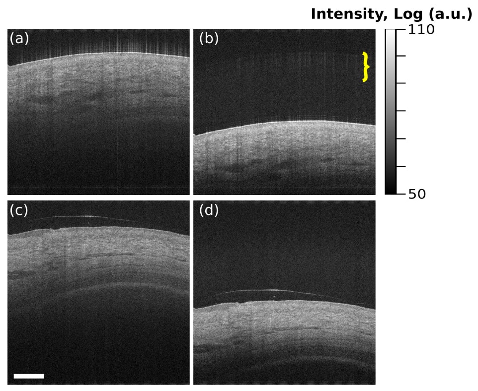 In the image on the left, such an artifact is visible in the human skin image, highlighted by the yellow bracket (a-b). It appears at a shallower depth than the main image because light traveling through the inner cladding experiences a shorter optical path than light guided in the core, owing to the lower refractive index of the inner cladding. As reported in this study, the authors used index-matching gel at the fiber–air interface to reduce specular reflections into the inner cladding, which were the main contributor to crosstalk in the system (c-d). However, depending on the system configuration and the sample being imaged, such a strategy may not always be practical.