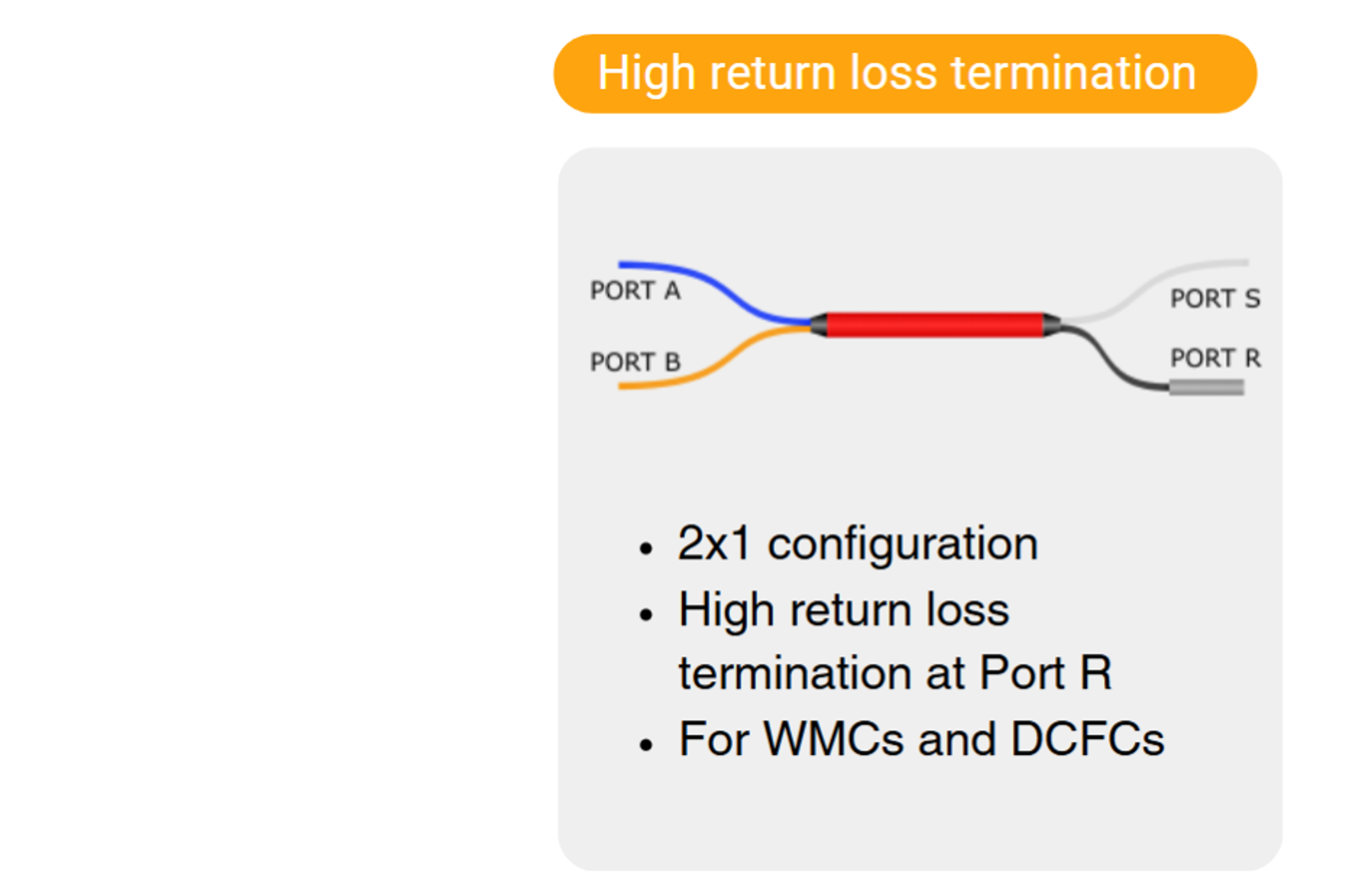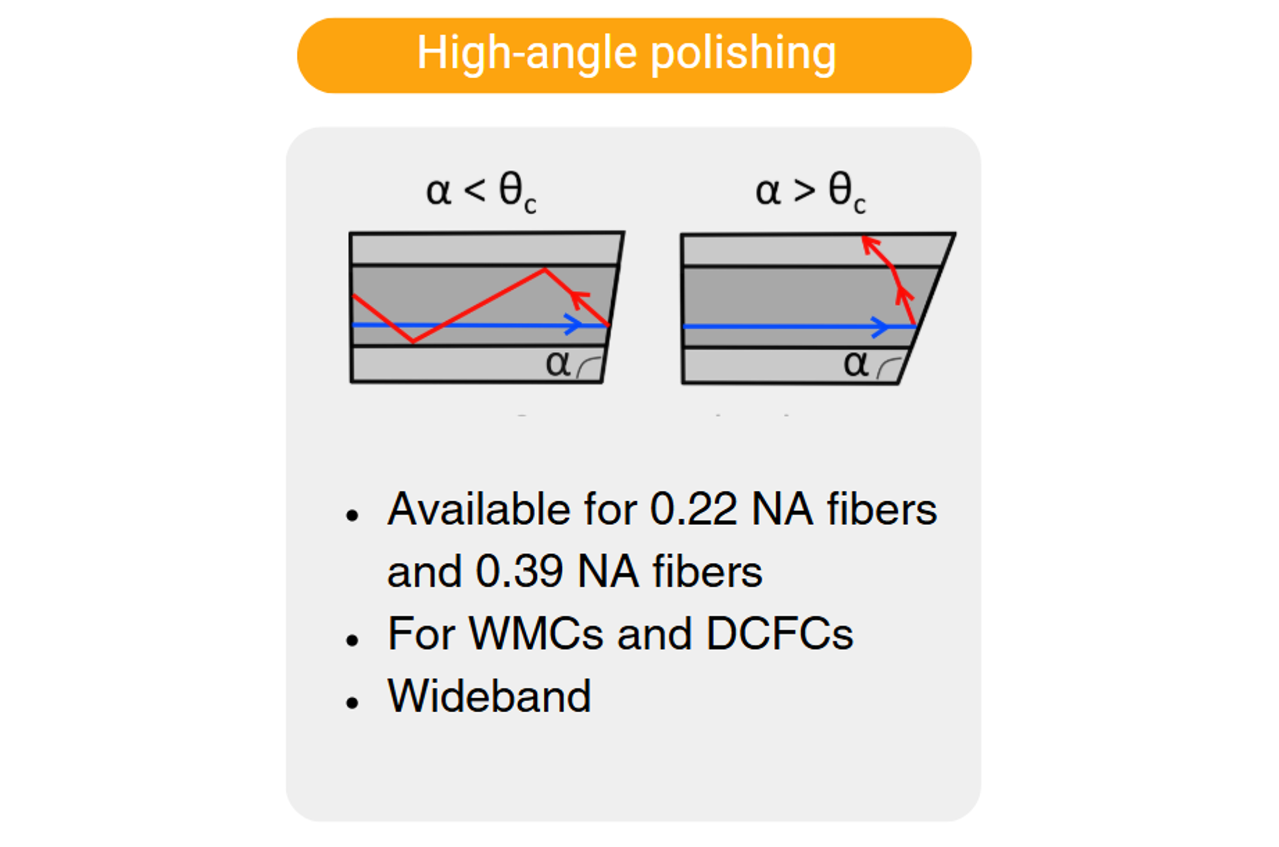 To optimize the return loss performances of our Wideband Multimode Circulators (WMCs) and Double-Clad Fiber Couplers (DCFCs), our team has developed dedicated fiber termination and connectors. High-angle connectors compatible with 0.22 NA and 0.39 NA fibers are now available for all our products, ensuring reduced back-reflections for a large bandwidth. For single-mode or narrowband modalities, we also offer AR-coated connectors. They are designed to effectively reduce the amount of back-reflections for a specific wavelength range. When using a fiber optic coupler for sensing applications, the 4th Port, opposite to the illumination Port, is typically unused, but can contribute to return loss, returning any residual power to the detection Port. Our team has developed an improved 2x1 packaging for DCFCs, including a high return loss termination at the 4th Port, improving overall SNR.