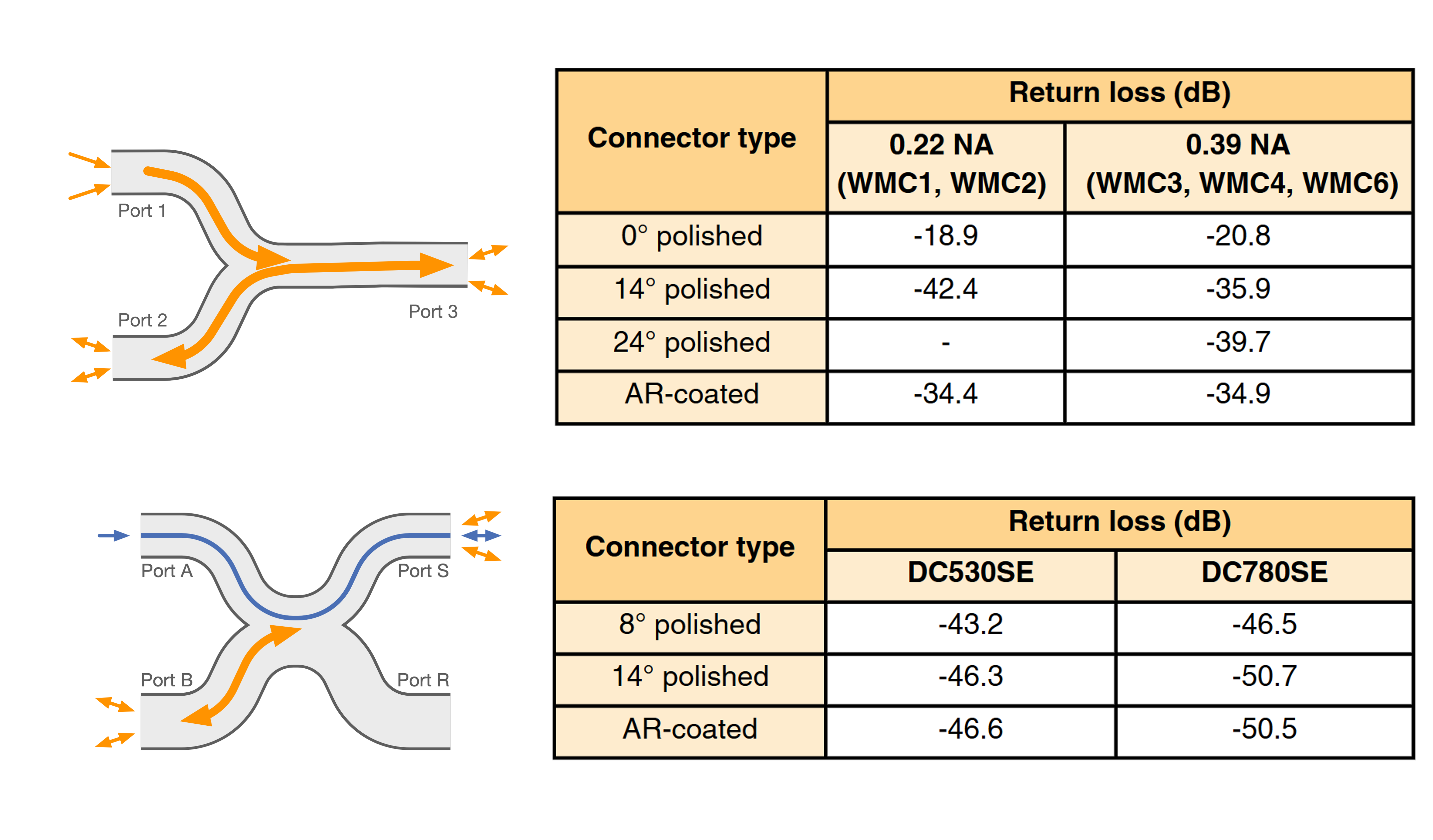 The performance of high-angle connectors and AR-coated connectors was assessed and benchmarked against standard flat (0° polished) or APC (8° polished) connectors. The first table below shows return loss performances for 0.22 and 0.39 NA fibers. The values for the 0.22 NA fiber were measured on a WMC2. The values for the 0.39 NA were measured on a WMC3. A broadband white light source was used for all measurements. For DCFC units, measurements were performed at 633 nm for the DC530SE and at 850 nm for the DC780SE.