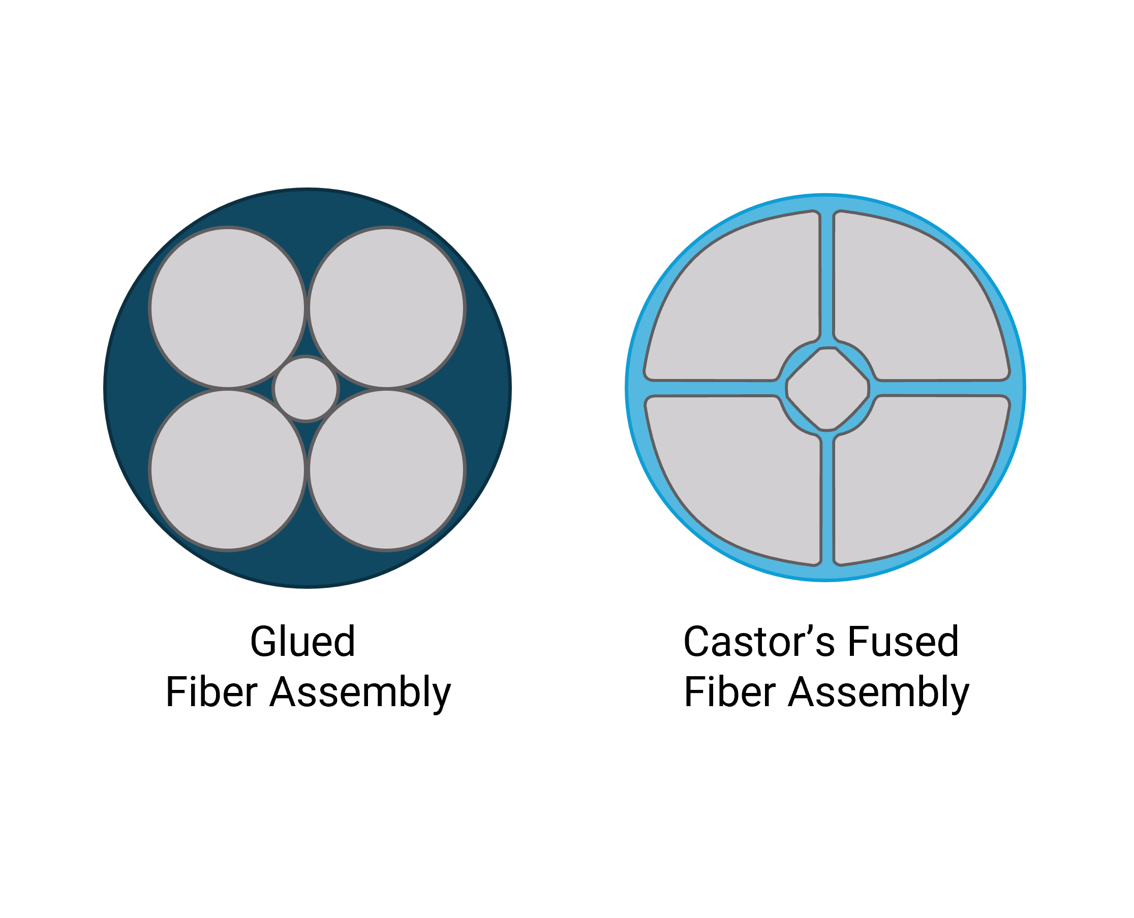 Castor Optics’ fused fiber bundles provide a compact solution for combining multiple illumination and collection channels into a single monolithic assembly. Designed with circular symmetry and no air gaps, these structures maximize the effective collection area while minimizing the overall diameter. They are suited for high-precision and low-light sensing conditions.